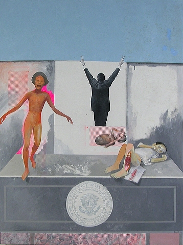 Wolfe used images taken directly from the media coverage of the day. Thus every figure represented is a portrait of a real individual, such as the famous photo of a young girl fleeing from a napalm bomb and a group of victims from the massacre at My Lai. The disfigured images are shocking to the viewer, forcing the viewer’s confrontation with the horrors of war. As with many of his political works, Wolfe sought to disrupt a public complacency through forcing a level of emotional contact with the tragic human outcomes resulting from oppressive applications of American power.